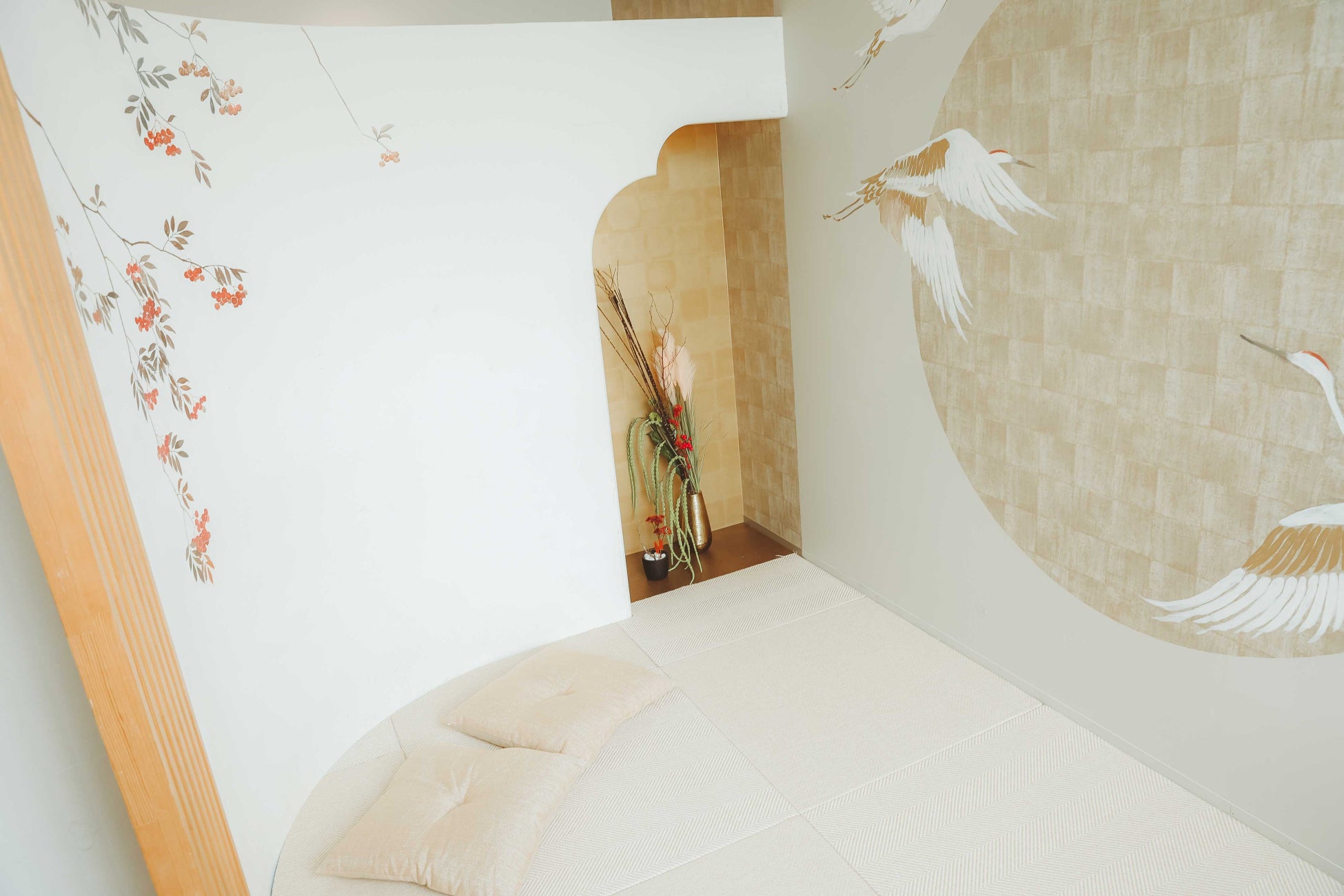 現在の和モダンスタジオを生かした和空間を展開します。大きな鶴が壁面に描かれた、より王道の和室を完備しております。畳の上で、お正座や立ち姿、どこを切り取っても画になる真紅色が差し色の華やかで豪華な空間です。