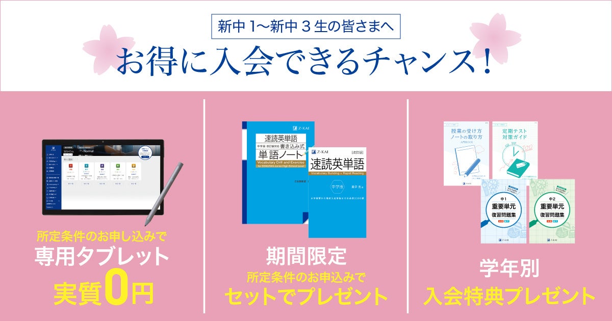 Z会では、期間限定の早期入会特典として『速読英単語 中学版 改訂版』と『速読英単語 中学版 改訂版対応 書き込み式単語ノート』をセットでプレゼント。さらに、学年別の各種入会特典や、所定条件でZ会専用タブレットを実質0円で購入できるなど、さまざまな形で「新入学・進級に向けて、好スタートをきりたい!」という方を応援します。お得なこの機会をぜひご利用ください。
