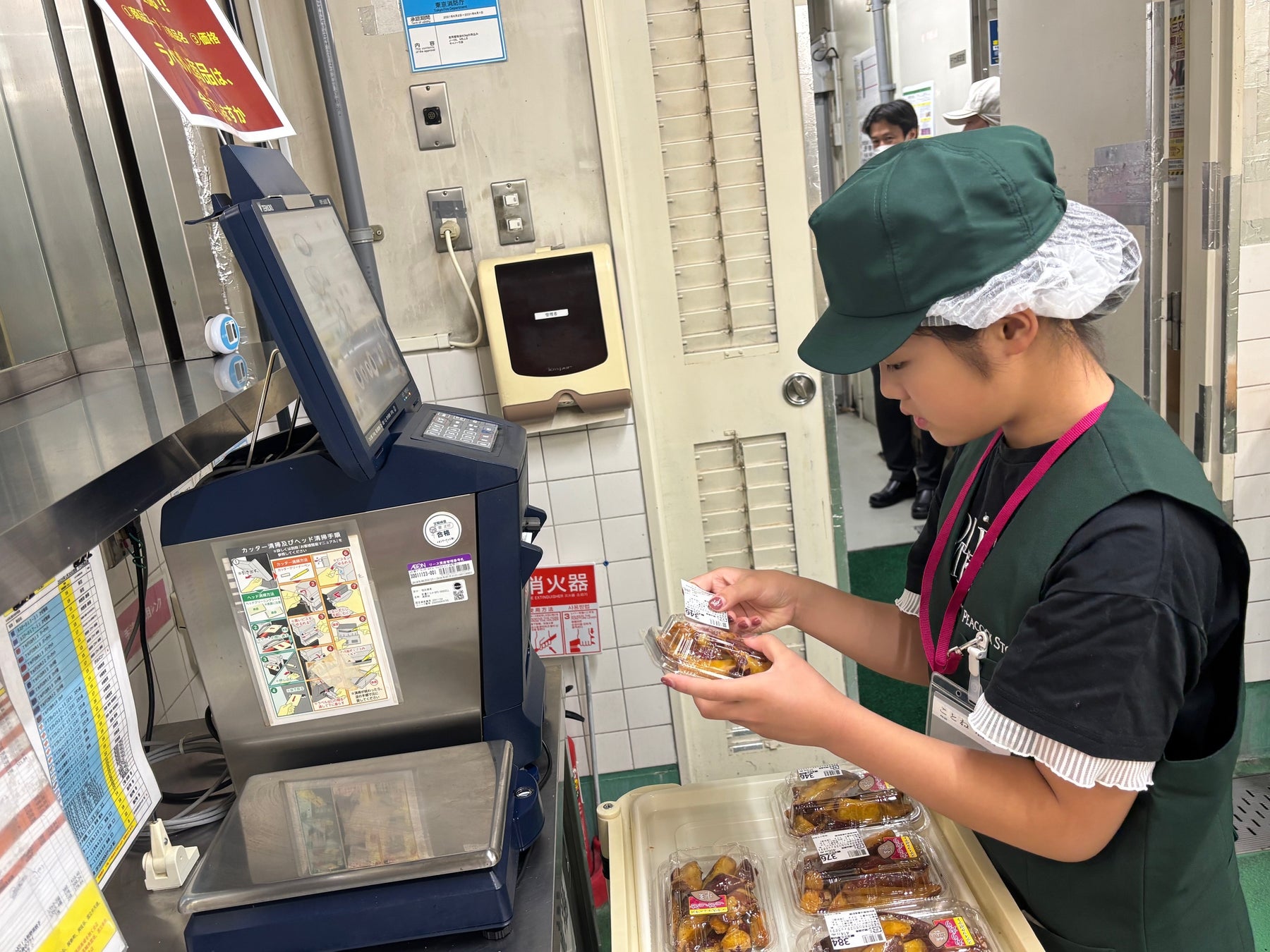 「私の夢を叶えてくれてありがとうございました。今回の体験を通して、ピーコックストアのお店に商品が並ぶまでに店員さんがされている様々なお仕事や工夫を知ることができました。特に印象に残っているのは、お魚屋さんで分厚く切られたお刺身の盛り付け、お肉屋さんの冷凍庫にあった大きなお肉の塊、八百屋さんには全国から届けられた新鮮な果物や野菜、デリカでのシール貼りやPOP作成のお仕事など、バックヤードには、たくさんの商品やお仕事があって驚きました。これまで、ピーコックストアで当たり前のように買い物をしていましたが、今後買い物をするときには、教えてもらったことを思い出して、お店で働いている店員さんに「ありがとう」の気持ちを持って、お買い物をしたいなと思いました。」