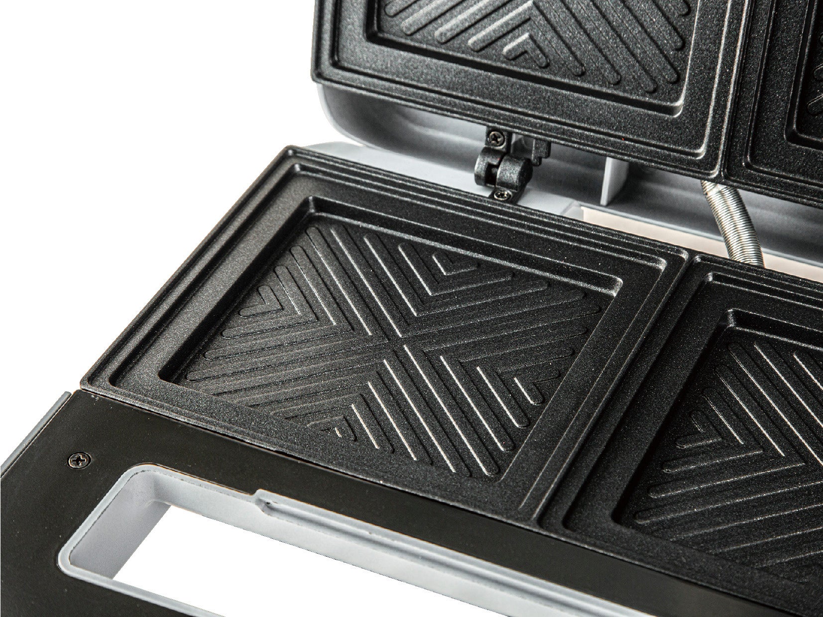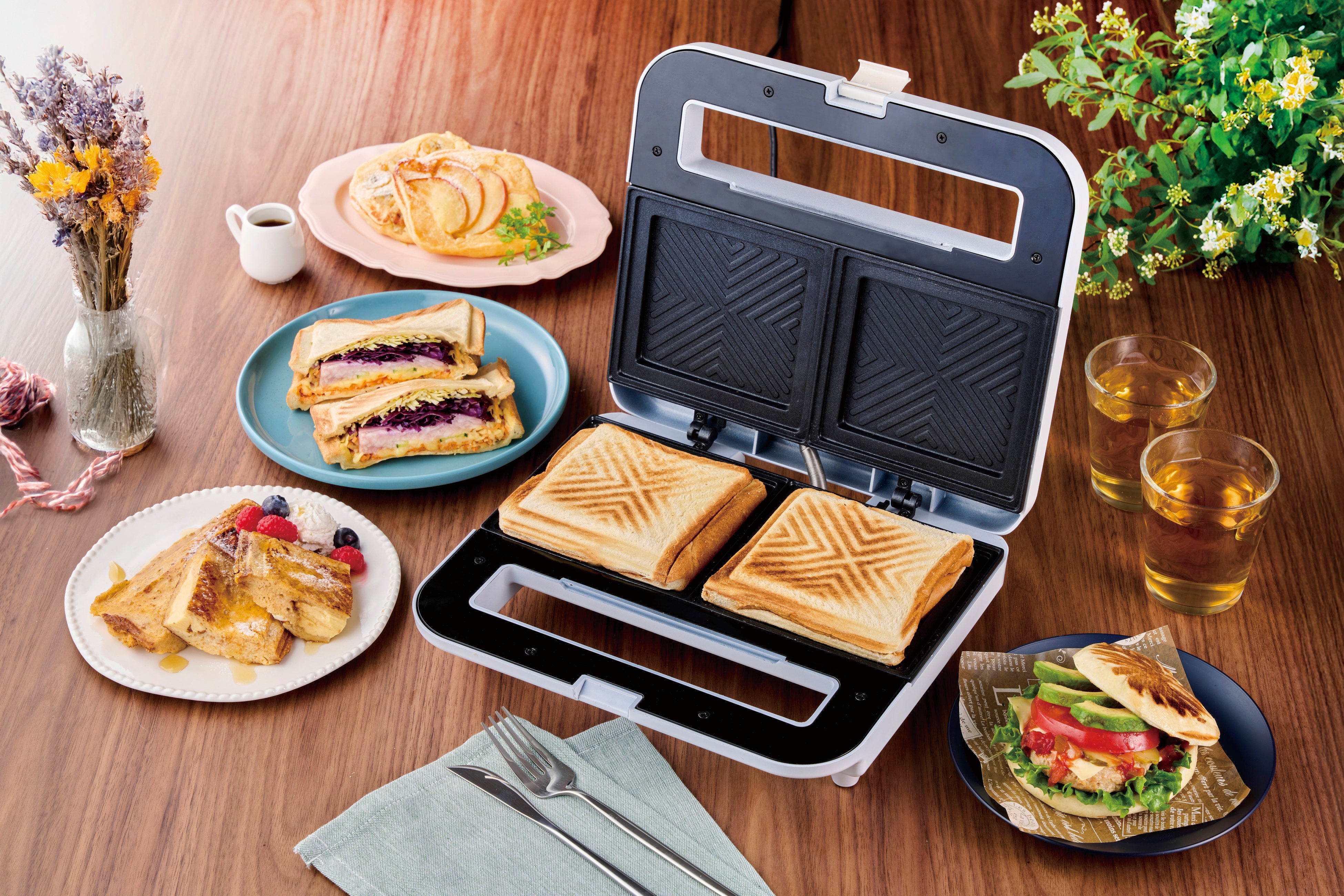 本製品は、一度に2枚のホットサンドが簡単に作れるため、家族みんなでいろいろな味を楽しめます。パンの耳をカットせずにそのまま焼けるゆとりのあるプレートサイズで、具材がこぼれにくい設計も特長です。アレンジレシピ集もついており、ホットサンド以外にもスイーツやおかず作りなど、幅広いメニューをお楽しみいただけます。