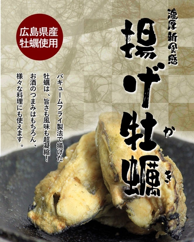 バキュームフライ製法で揚げた牡蠣はサクサクした食感と牡蠣の濃厚な旨味をお楽しみいただけます。味付けや添加物は使用しておらず、広島県の海で養殖された牡蠣そのものを味わえる商品です。