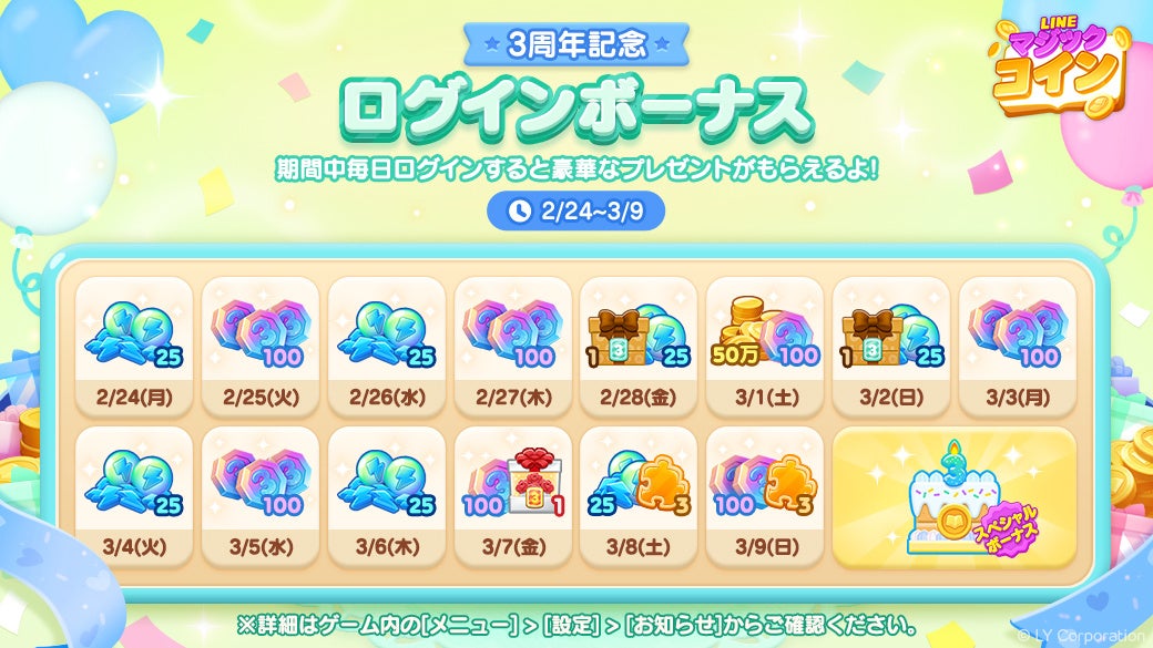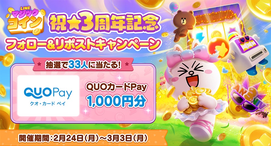 LINEヤフー株式会社では、当社が展開するカジュアルコインゲーム「LINE マジックコイン」が、2025年2月28日(金)で3周年を迎え、この節目をお祝いした、特別な報酬がもらえる豪華イベントや、QUOカードPay1,000円分が当たる公式Xキャンペーン豪華を開催します。