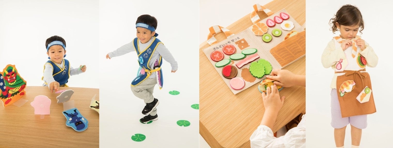 「なりきりエプロン」と「フェルト小物」が絵本に集約され、バッグのように持ち運びが可能で、いつでもどこでも子どもが楽しめる「なりきりごっこ遊び」ができるのが特徴です。