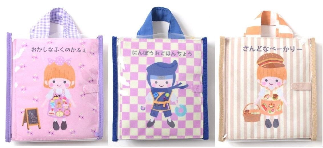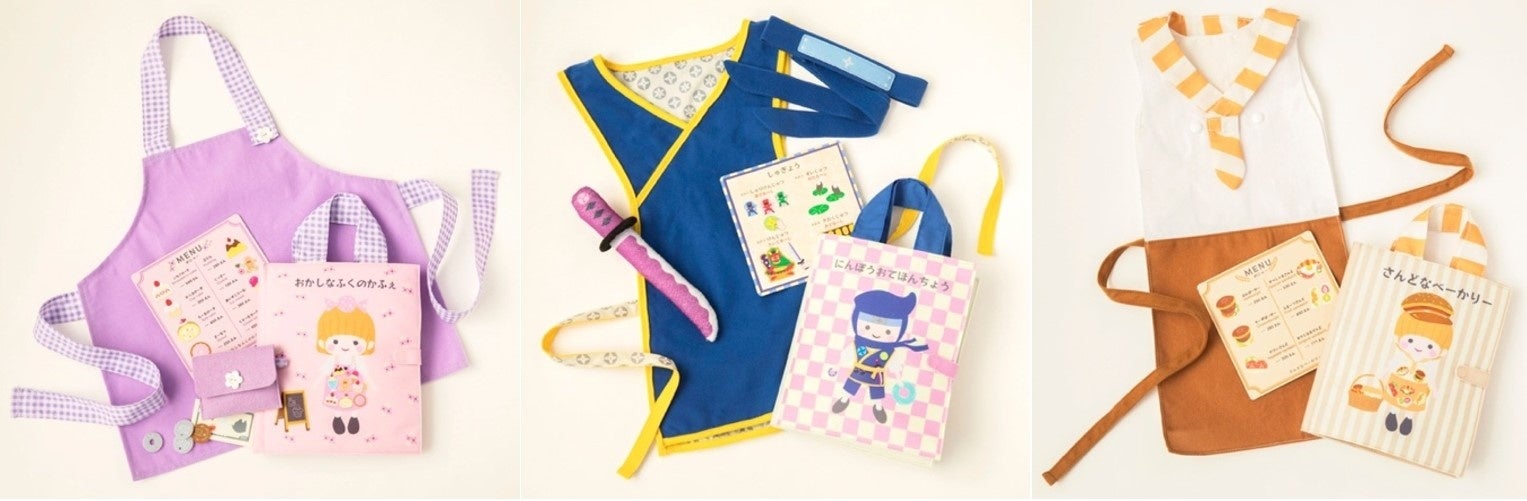 第一弾は、カフェスタッフになりきる『おかしなふくのかふぇ』、忍者になりきり修行をする『にんぽうおてほんちょう』、パン屋になりきり色んなサンドを作る『さんどなベーかりー』の3種を、ナルミヤオンライン(https://www.narumiya-online.jp)で発売します。