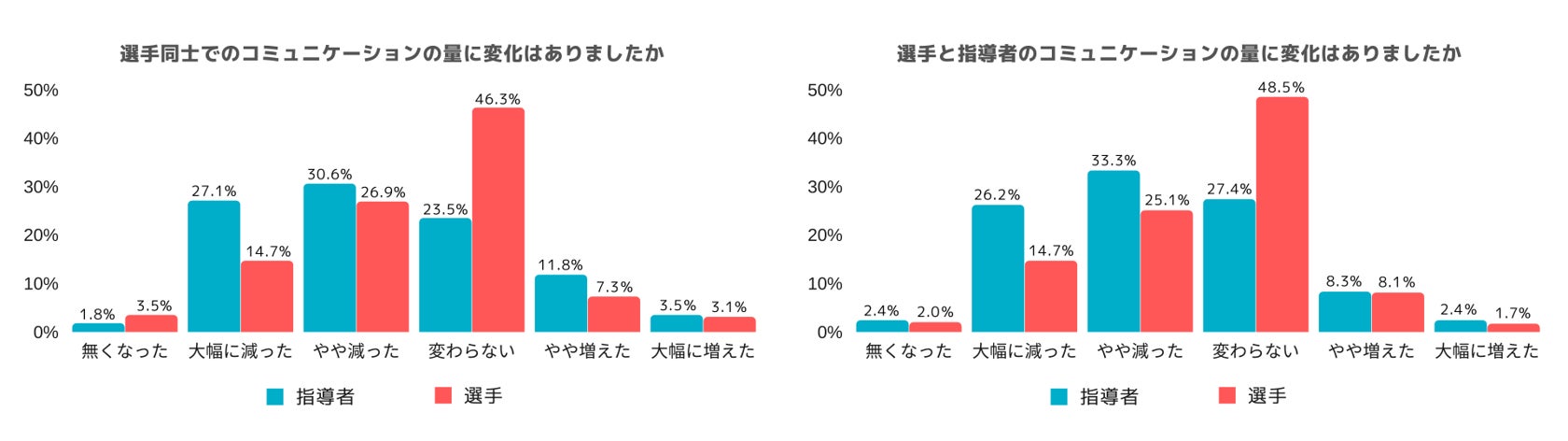 また、指導者に、選手と指導者間のコミュニケーションについて聞くと「無くなった」2.4%、「大幅に減った」26.2%、「やや減った」33.3%で、合わせて61.9%となり、「変わらない」は27.4%となりました。