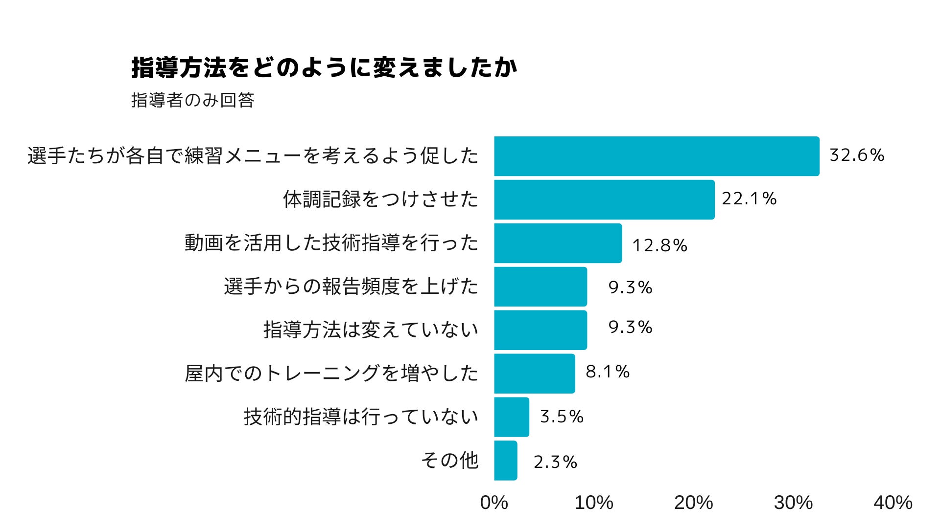 感染拡大を回避するために自主練習を含め、練習自体を減らしたチームと、対面での練習に制限がある分、自主練習に力を入れたチームがおよそ半々に分かれる結果となりました。