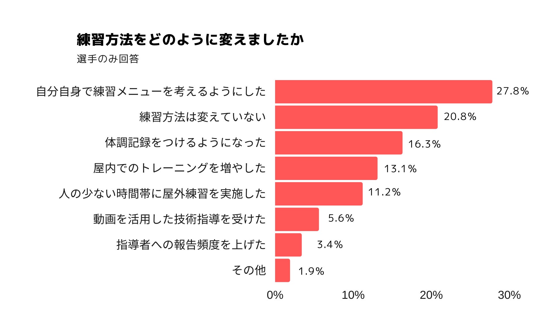 選手から緊急事態宣言解除後の練習方法の変化について聞くと「緊急事態宣言中と変わらない」34.5%、「練習方法がやや変わった」45.9%、「練習方法が大幅に変わった」19.6%となりました。