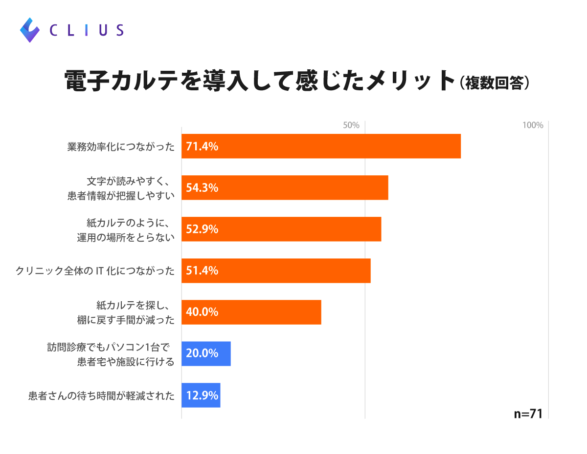 電子カルテを使用している医師のうち、電子カルテを導入して得たメリットとして、「クリニック全体のIT化につながった」と答えた人が51.4%、「業務効率化につながった」と回答した割合は71.4%にまでのぼりました。