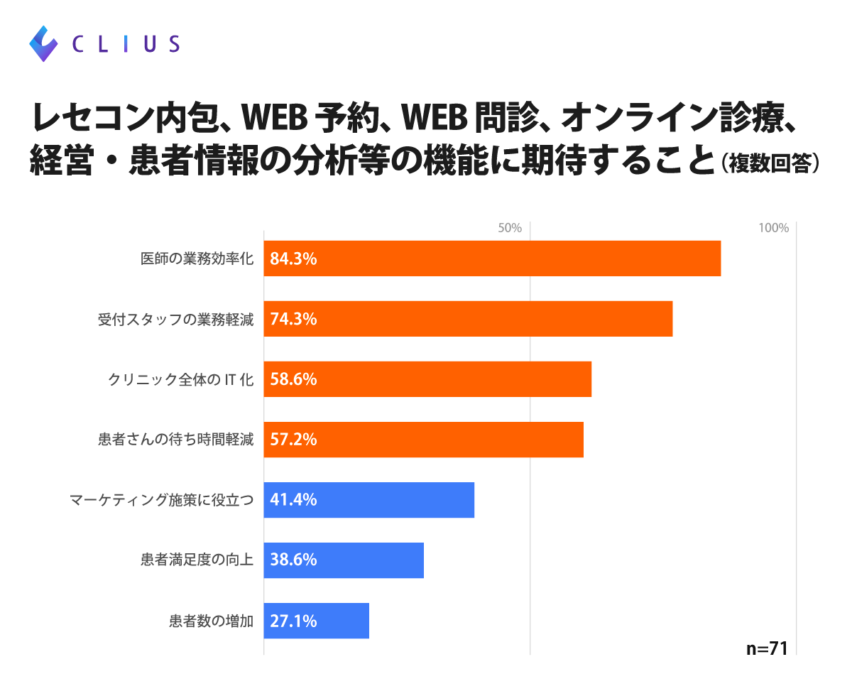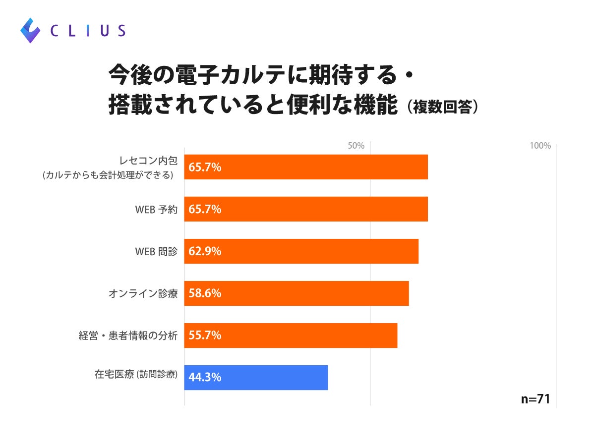 単なる利便性や効率化のためだけではなく、電子カルテを軸とした診療範囲のIT化によってクリニック経営全体が改善されることへの期待や要望が読み取れる結果となりました。
