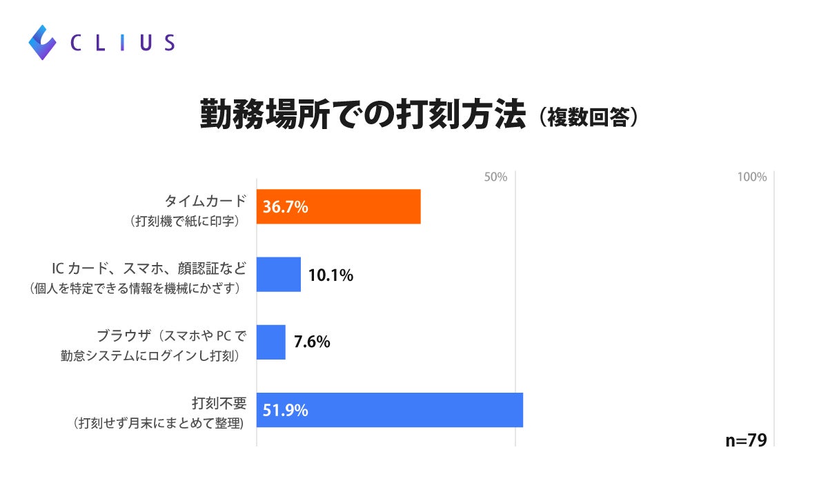- 勤務先での打刻は30%以上が紙であり、クリニック経営全体でのIT化については課題が残る。