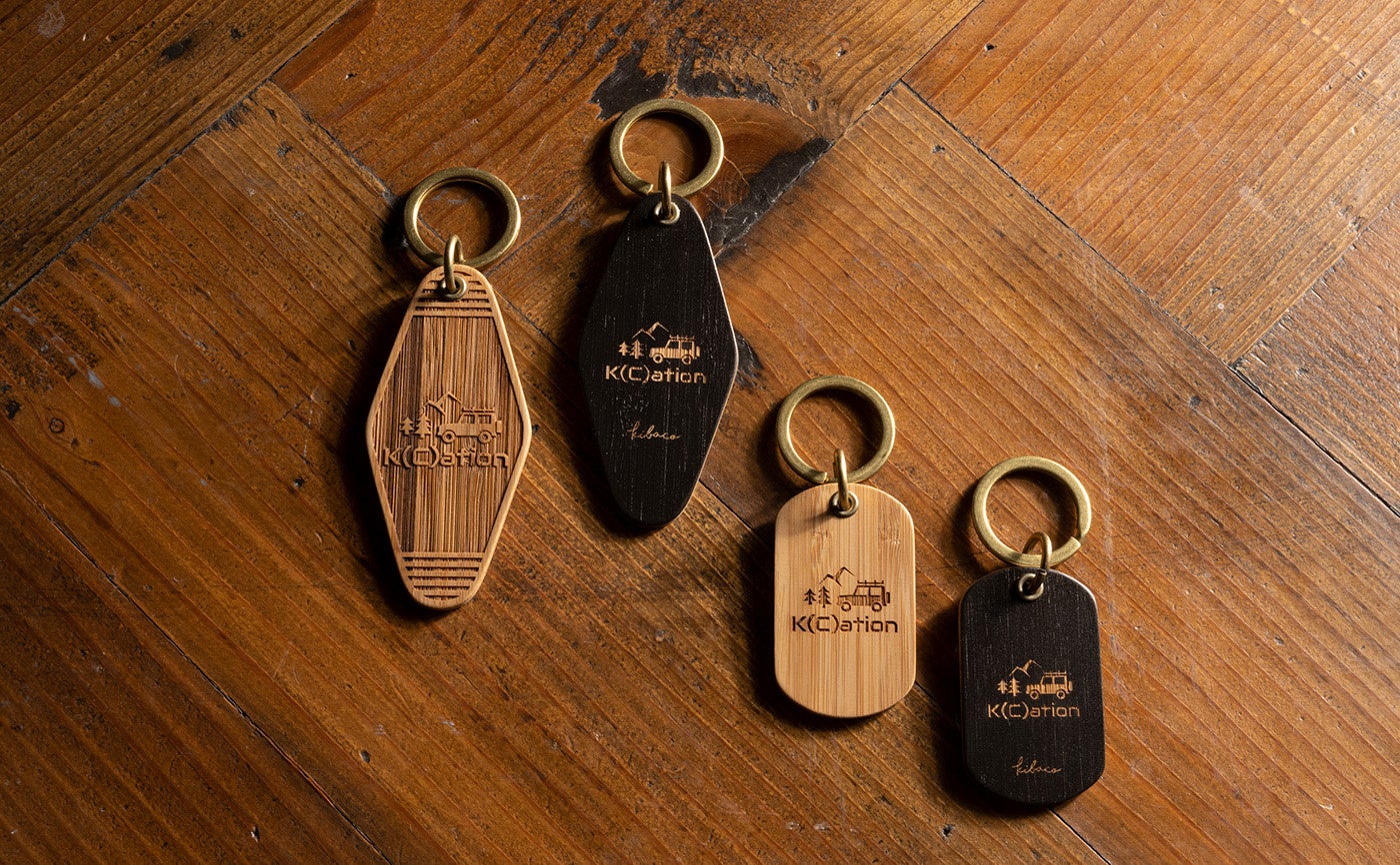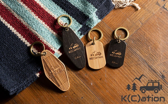 種類はアメリカンビンテージのモーテルキーを忠実に再現した「モーテルキータイプ」、ミリタリーテイストな形状の「ドッグタグタイプ」の2種類。デザインは、温もりのある木目にK(C)ationのロゴとkibacoのロゴをシンプルに描いた「ロゴ」、シックなブラックのプリントに彫刻を施し、裏面に山や車などのモチーフを描き起こしたブランドオリジナルの「カモフラ」からお選びいただけます。