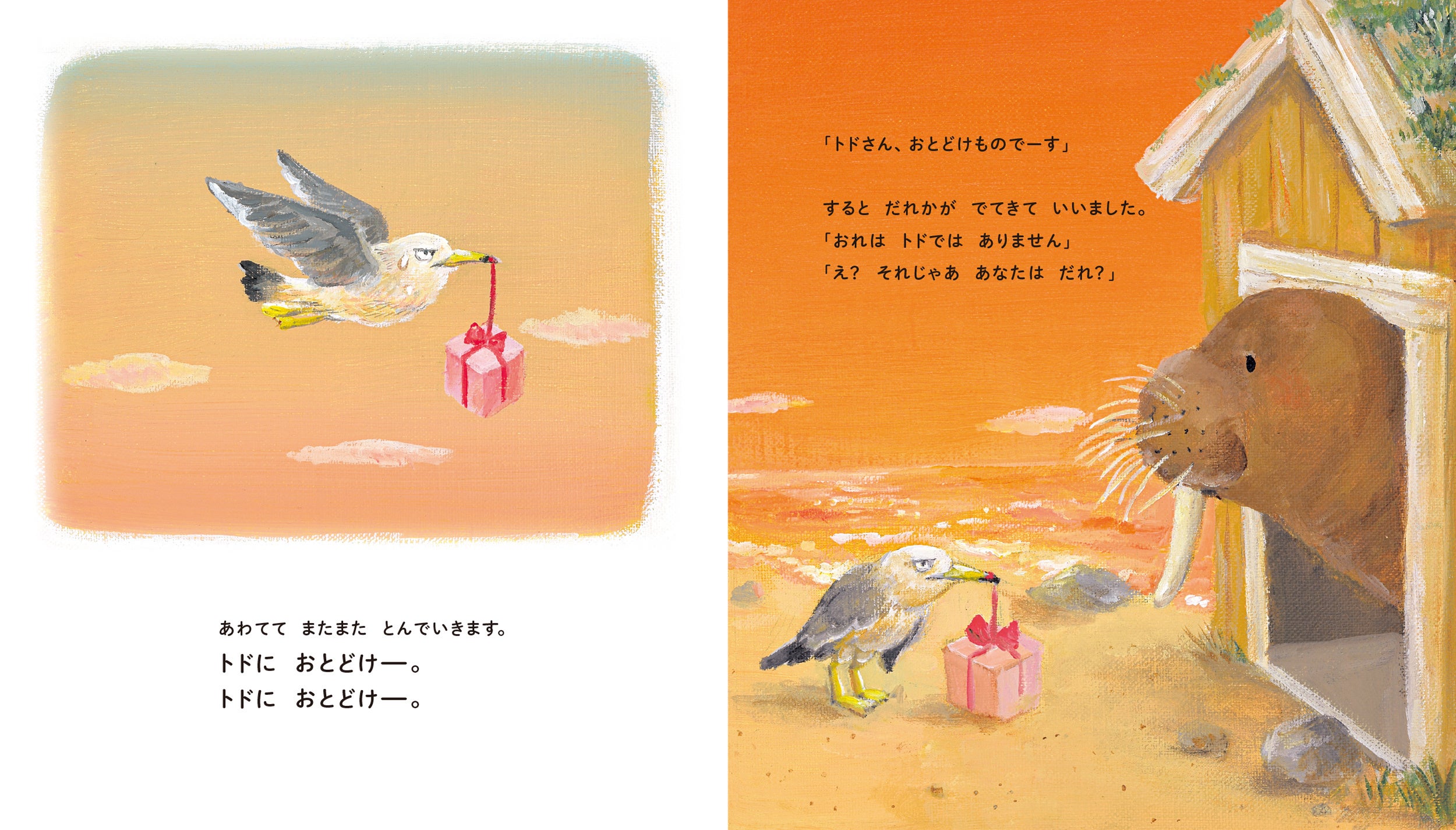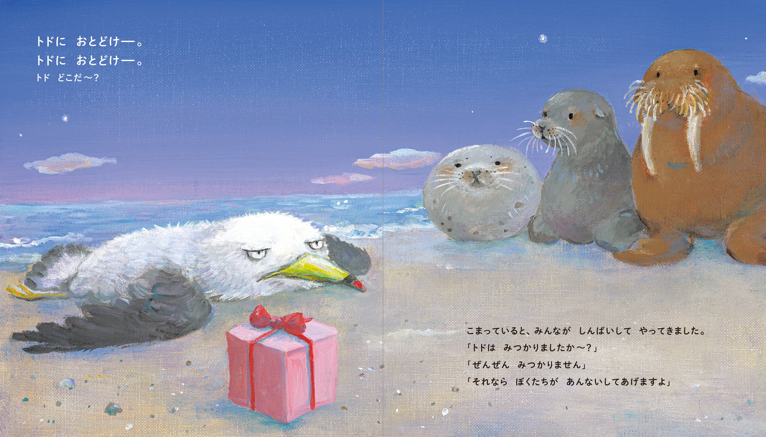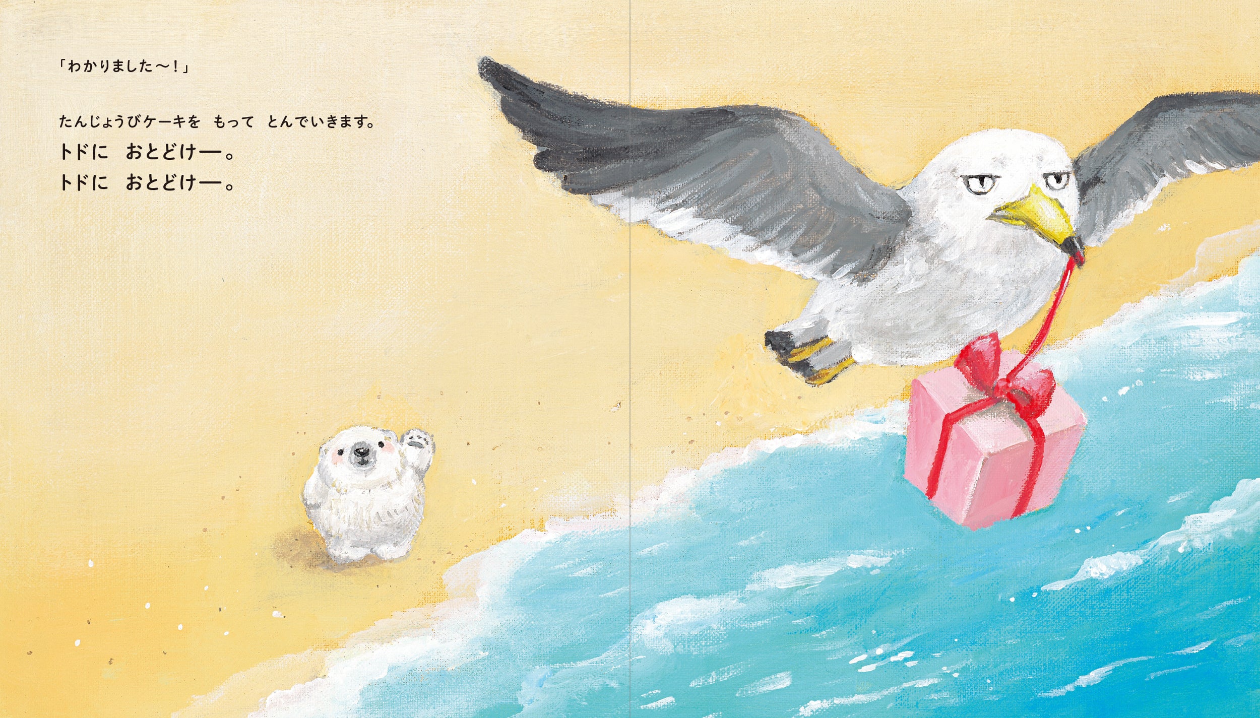 トドに誕生日ケーキを届けることになったカモメ。ところが、おうちから出てきたのはトドによく似たアシカ。次に出てきたのも、これまたよく似たアザラシ。なかなかトドまで辿り着きません。やっと会えたと思ったら…?