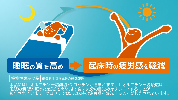 疲労感軽減のメカニズムに着目し、「L-オルニチン一塩酸塩」と「クロセチン」のW成分を日本で初めて※1配合しました。睡眠の質を高めることで、より良い気分の目覚めをサポート※2し、起床時の疲労感を軽減※3。毎朝の心地良い目覚めが、1日の始まりを元気に導きます。
