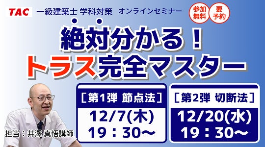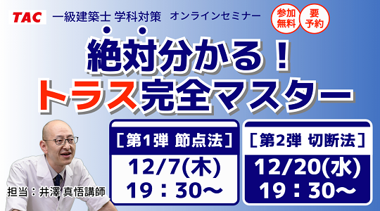 【TAC建築士講座】オンラインセミナー実施!一級建築士(学科)絶対分かる!トラス完全マスター[第1弾 節点法][第2弾 切断法]