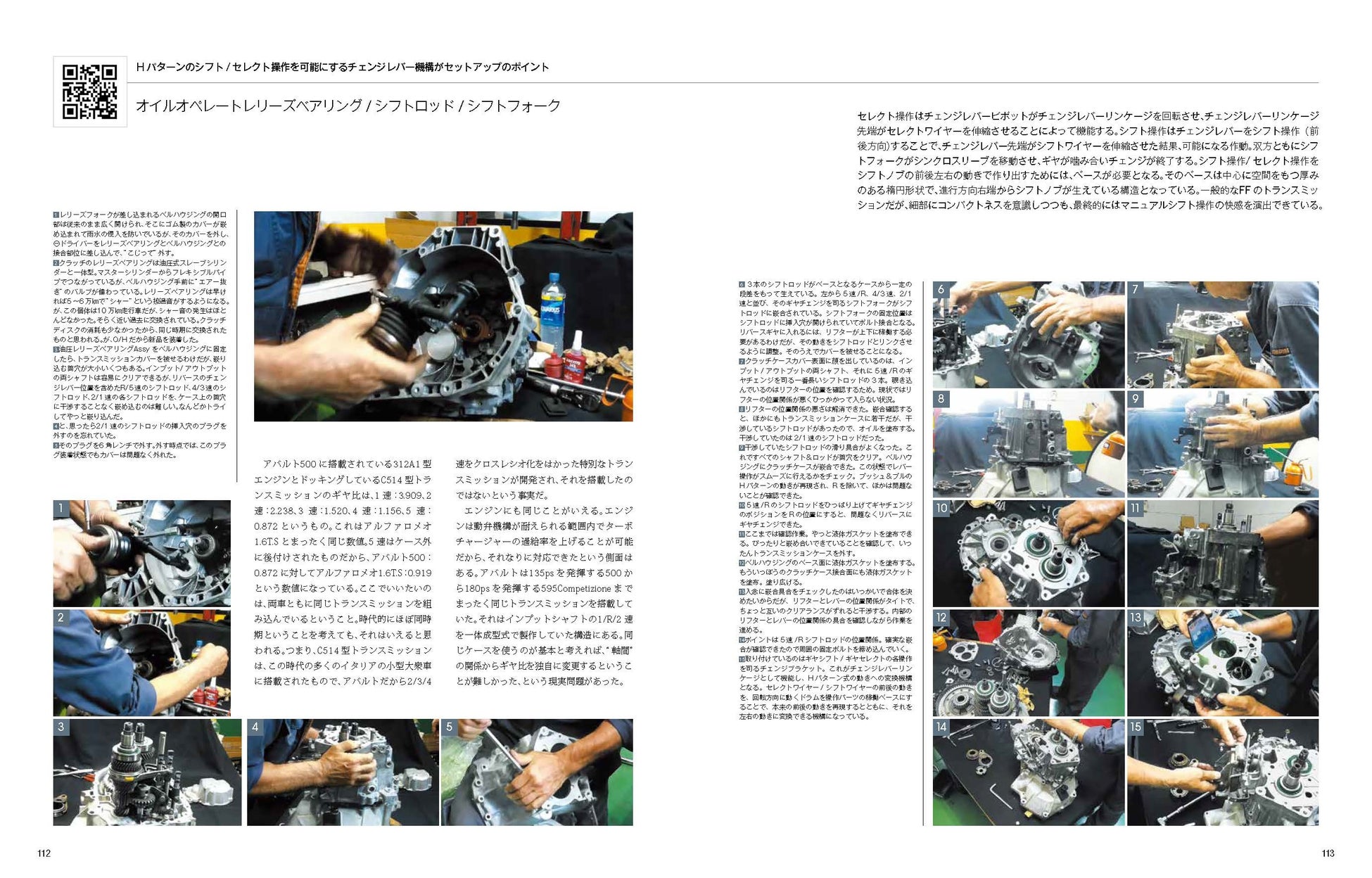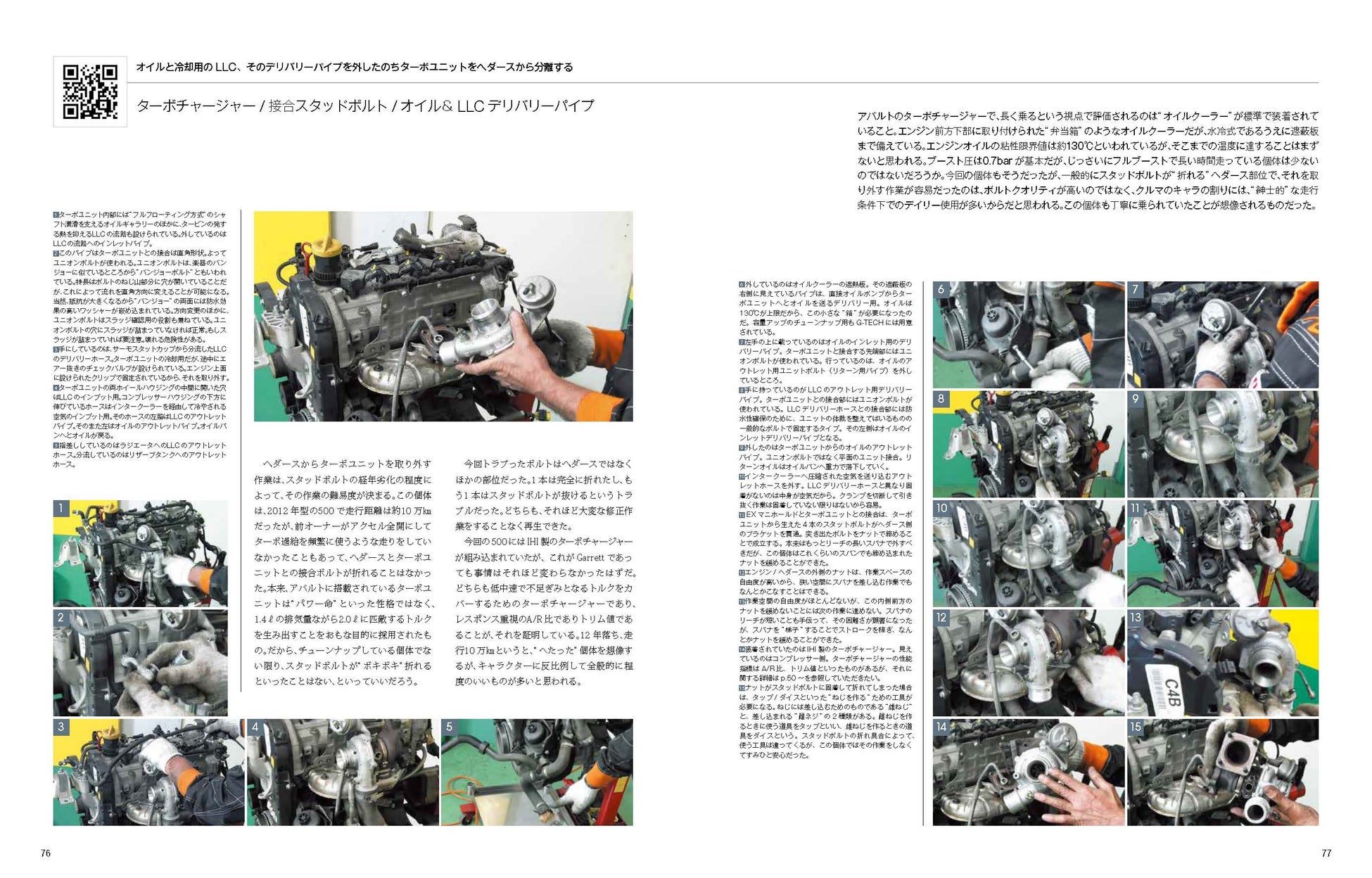オークションで10 万㎞弱走行の“ アバルト500” を購入。これを全分解して“ 経年劣化”の程度をチェックしようというのが、本誌の編集基調です。なので、マイナーなトラブルを遂次取り上げることは排除して、エアクリーナーケースを取り外す最初の作業からトランスミッションをケースから抜き取る最終行程まで、その作業を密着取材して一冊にまとめています。その内容とリンクしたYou Tube動画へもQRコードで飛ぶことができます。