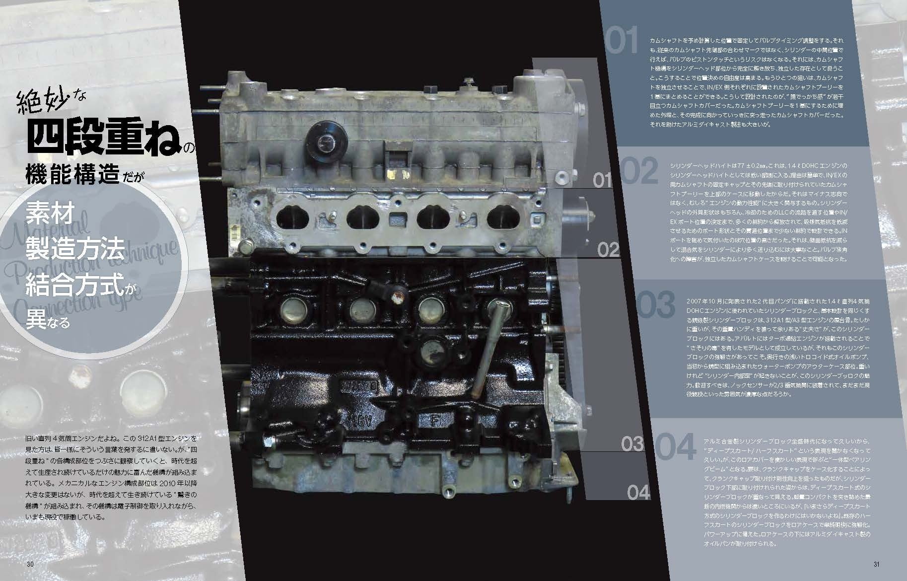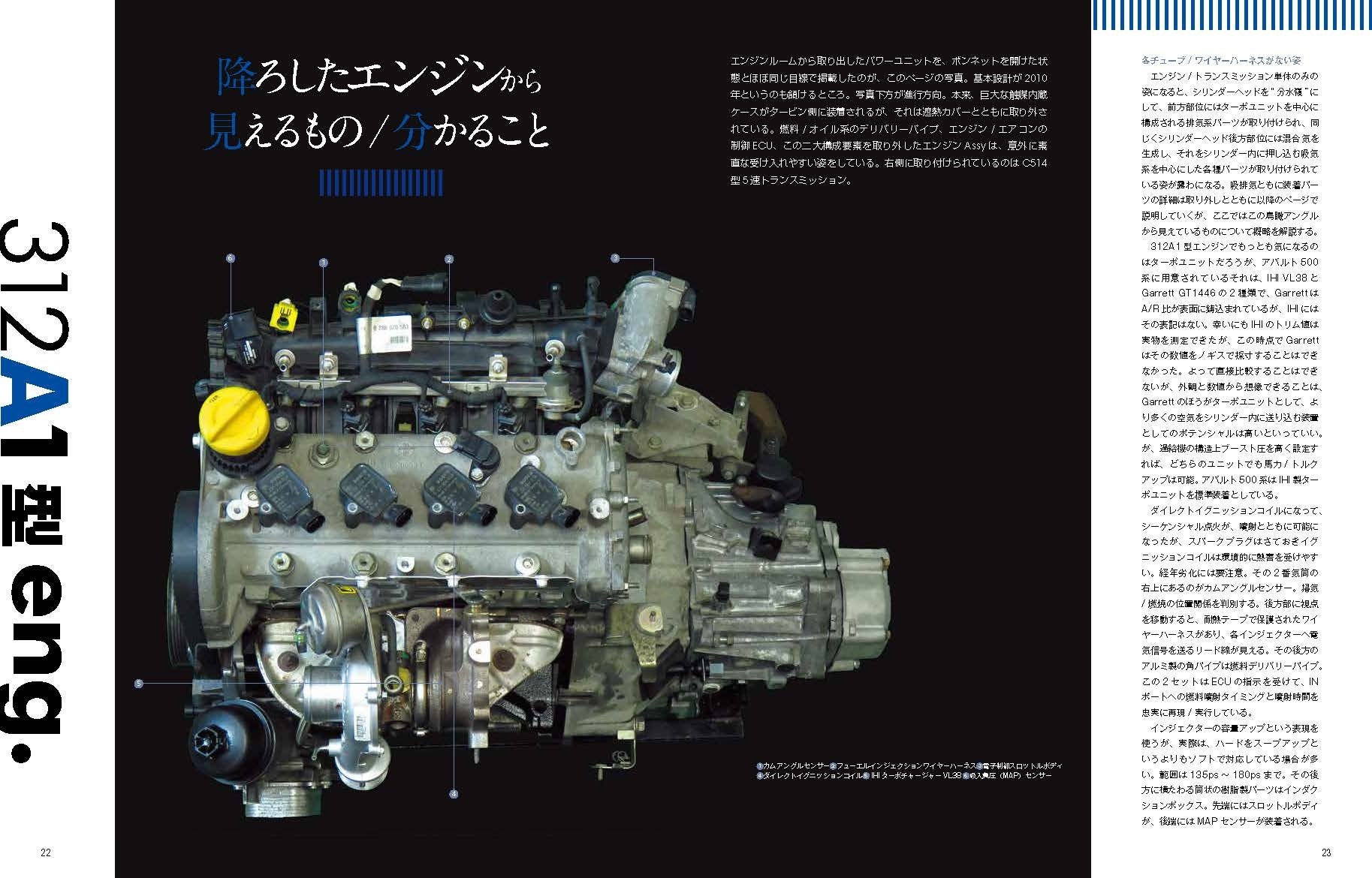 アバルトに搭載されている312A1型エンジンを上下/左右/前後のアングルから各部品の名称と構造を説明するページが14ページ続きます。アバルト搭載エンジンの概容が理解できるページです。