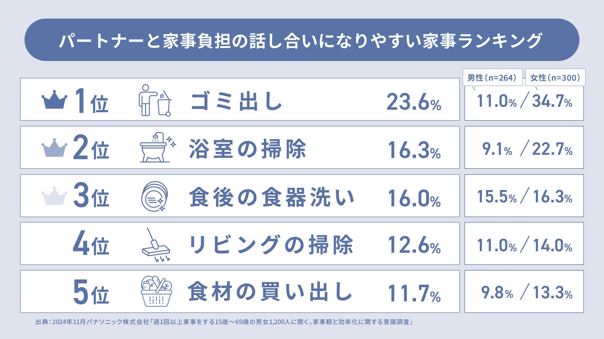 調査対象者の中でパートナーと同居している564人に、パートナーとの間で家事負担や家事のやり方について不満を持ったり、話し合いになったりしやすい家事について聞くと、「ゴミ出し」(23.6%)、「浴室の掃除」(16.3%)、「食後の食器洗い」(16.0%)の順となりました。「浴室の掃除」と「食後の食器洗い」は調査対象全体の「嫌いな家事」でも上位ランクインしており、負担感の大きい家事のようです。男女別で見ると、どの家事でも男性より女性の方が「話し合いになりやすい」スコアが高めで、特に「ゴミ出し」は女性からの指摘が多いようです。