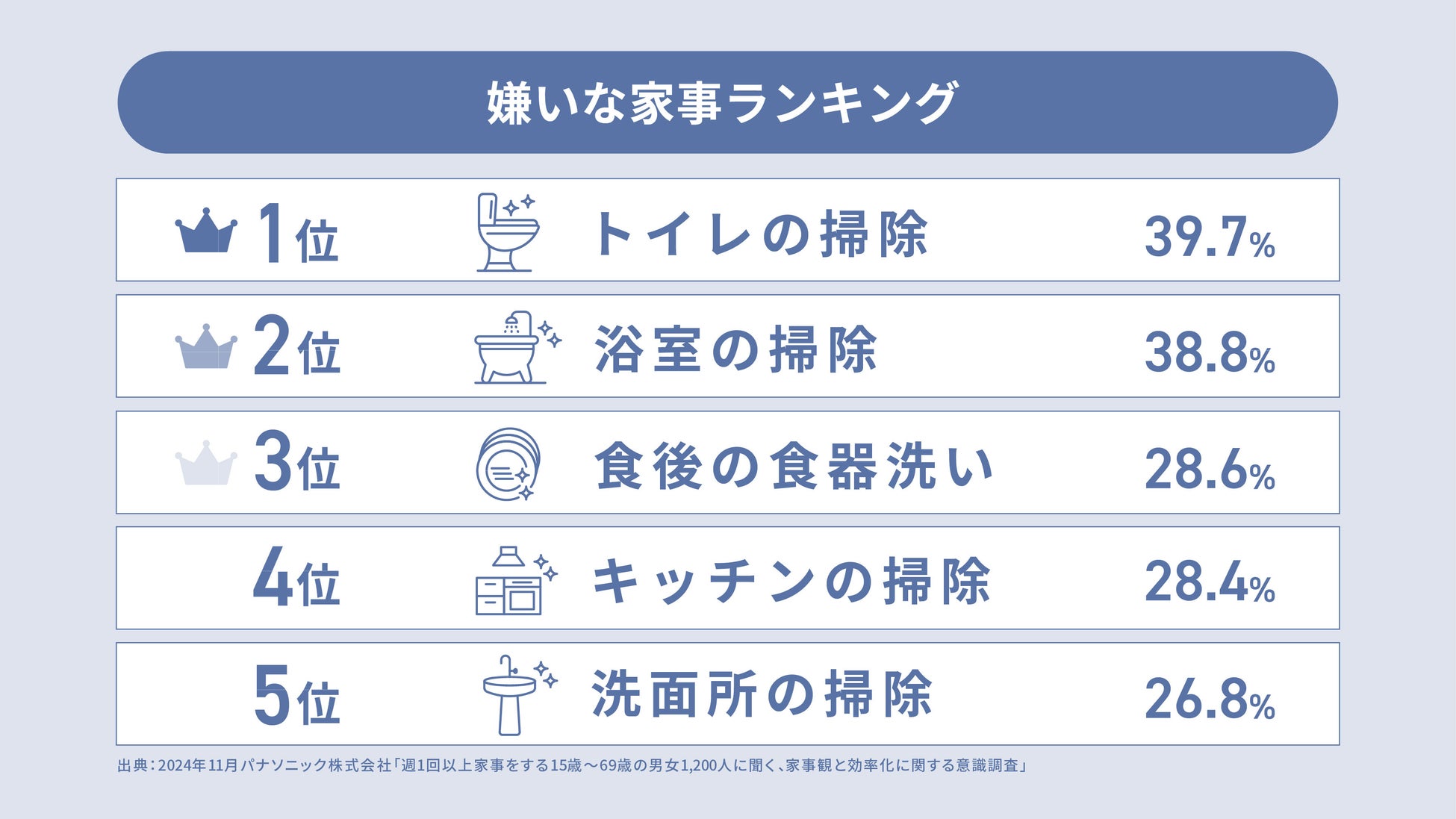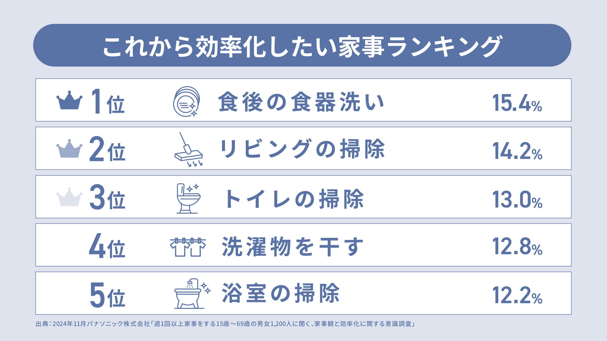 ●実施時期:2024年11月16日(土)~11月17日(日) ●調査方法:インターネット調査 ●調査対象:週1回以上家事をする全国の男女15歳~69歳 1,200人 ●調査委託先:マクロミル ※本調査に記載の数値は小数第2位以下を四捨五入しているため、合計が100%にならない場合があります。