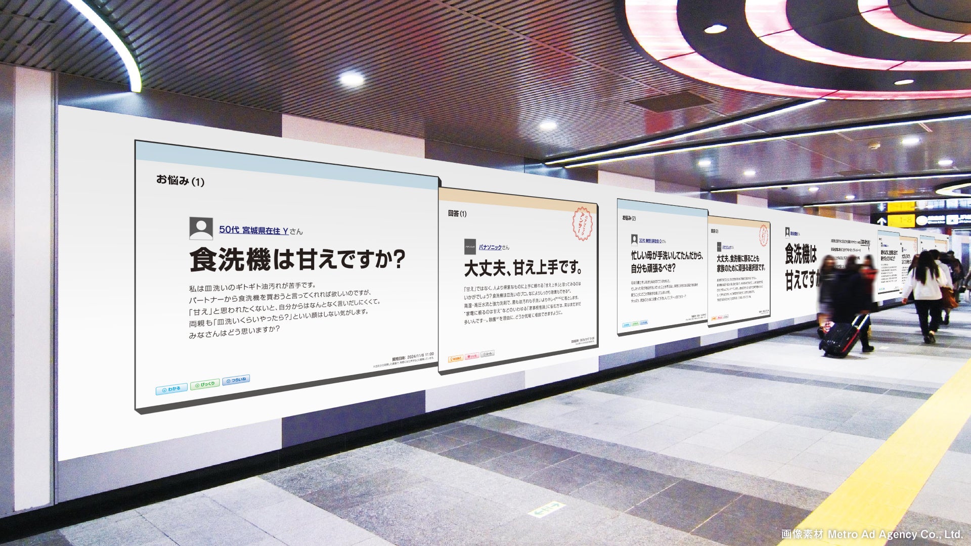 家事をするお客様へのヒアリングから生まれた「家事は自分の手でやるべき」と自らプレッシャーを感じたり、過度に周囲が期待する家事観「家事根性論」に基づくお悩み「食洗機は甘えですか」「素手で洗った方が汚れがよく落ちるんじゃないか…」などに対して、日常の家事や家事分担にまつわるモヤモヤにパナソニックが回答する、掲示板をデザインモチーフとした駅広告を渋谷駅にて掲出します。