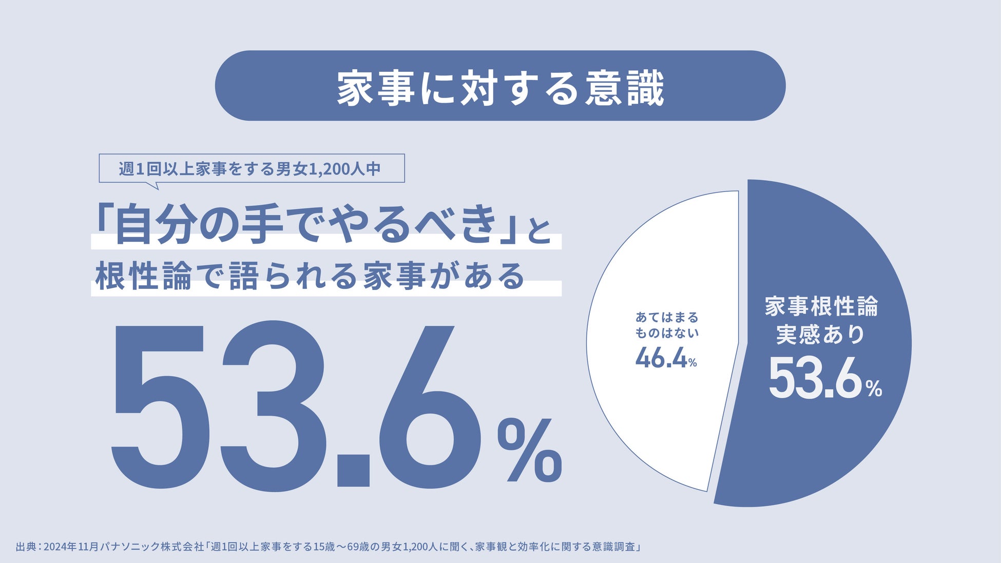 パナソニック株式会社は、週1回以上家事をする男女1,200人を対象に家事観と効率化に関する意識調査を行いました。その結果、約4人に1人は「家事は苦労してこそ価値がある」と回答し、さらに約2人に1人が、家事を家電に頼らず自分の手でやるべきと、自らプレッシャーを感じたり、過度に周囲が期待する家事があると実感しており、自分自身や周囲に対して家事を精神力で乗り越えるべきと考えている実態が明らかになりました。
