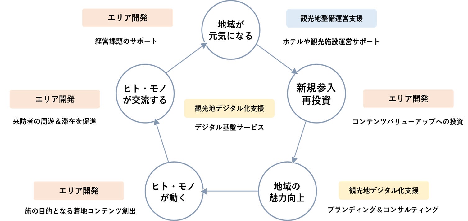 こうした中、JTBは、従来取り組んできた「旅行事業」や「地域交流事業」での知見や、「観光地デジタル化支援事業」「観光地整備・運営支援事業」および「エリア開発事業」により、観光地を一つのテーマパークに見立てて観光コンテンツをつなぎ、エリア全体の価値を高める事で、観光地、観光事業者および旅行者の課題を解決し、実感価値の向上を目指します。「エリア開発事業」では、戦略エリアを特定し、共通のビジョンのもとエリア全体と観光事業者の課題解決の「つなぎ手」となって、観光客が何度も訪れ、長く滞在したくなるような、魅力的な観光エリアの実現を目指し、既存コンテンツと新たに創出するコンテンツを有機的に接合していきます。JTBが率先し開発・投資をすることで地域を活性化し、他の投資の呼び水となり、収益が地域内に再投資される正の循環を生み出していきます。