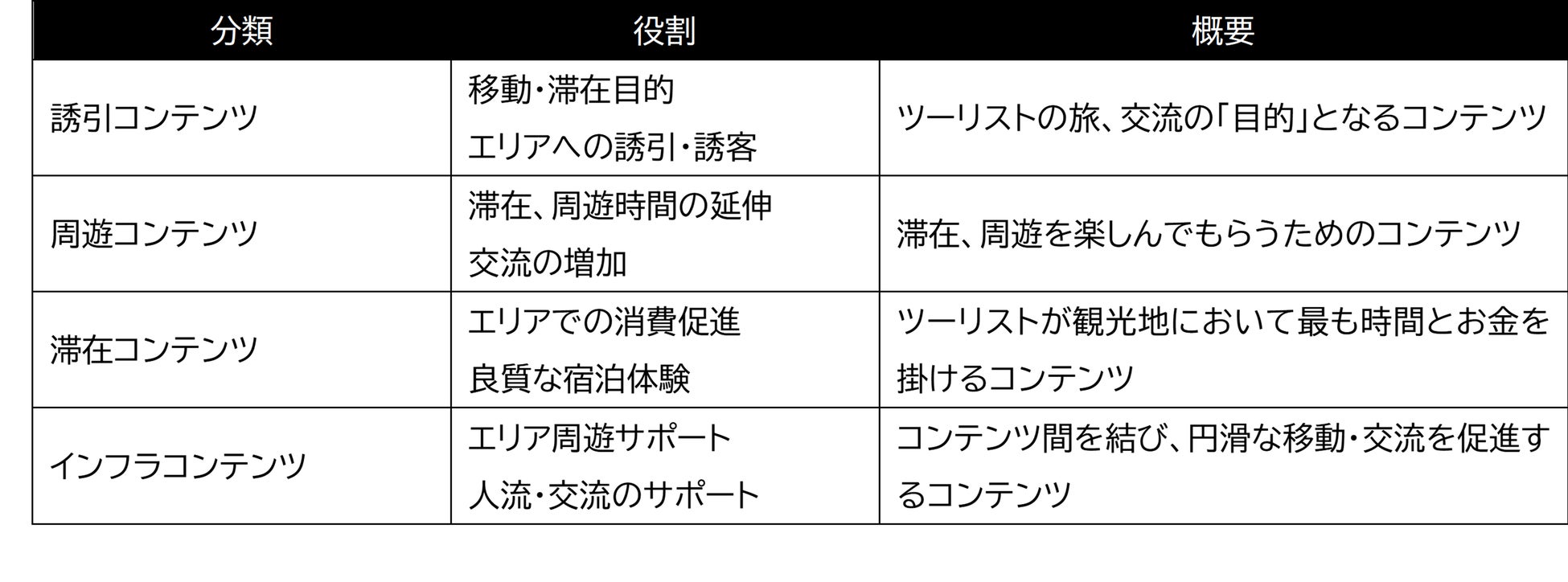 【観光地の持続的な発展に貢献するために必要なコンテンツ群】4種類のコンテンツを整備することで、観光地においては地域価値の向上、観光客においては交流の実感価値向上につながります。JTBは、今後全国の観光地において、4種類の中で足りないコンテンツを抽出し、自らが主体となってコンテンツを開発する事で持続可能な観光地づくりに寄与していきます。