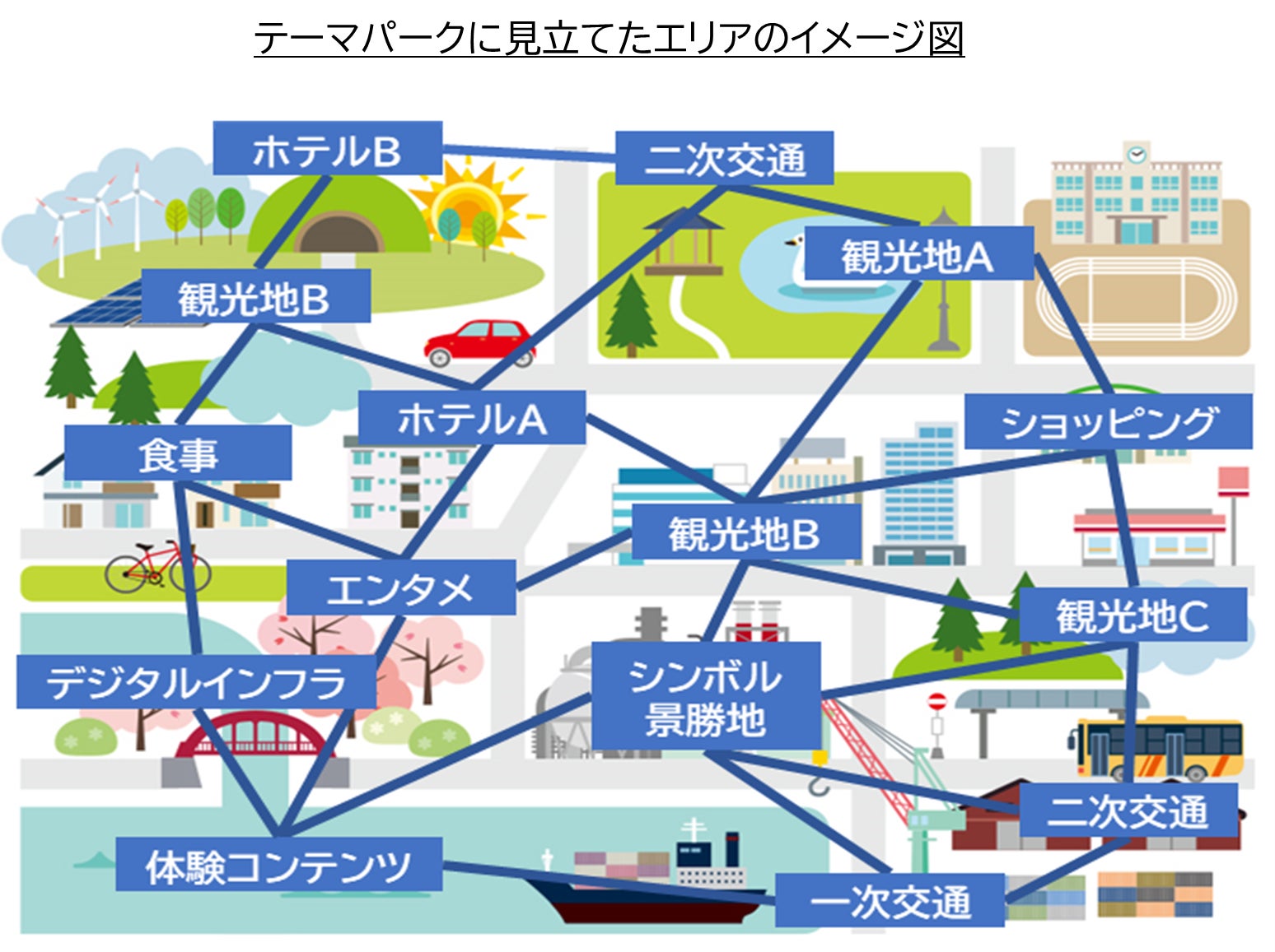 これまでもJTBは 「観光地デジタル化支援事業」「観光地整備・運営支援事業」および「エリア開発事業」により、観光地、観光事業者および旅行者の課題解決に貢献するとともに、観光地を一つのテーマパークに見立て、観光コンテンツをつなぎ、エリア全体の価値を高めることで、交流創造事業(*)の実現に取り組んできました。