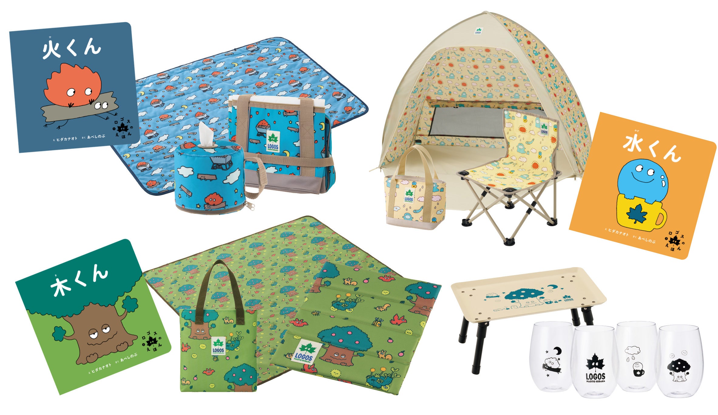 さらに、入賞者の方には「ロゴスのえほん」アイテムをプレゼントいたします。ワンタッチテントやテーブル、ソフトクーラーなどロゴスの人気アイテムに、「ロゴスのえほん」に登場する「火くん」「水くん」「木くん」のキャラクター柄を使用しており、ピクニックなどのアウトドアシーンはもちろん、ご自宅の中でもご活用いただけます。