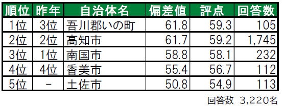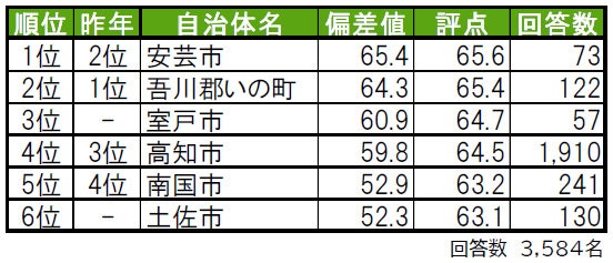安芸市が、昨年2位から順位を上げて1位に輝きました。2位は吾川郡いの町で、「住み続けたい街」「街に誇りがある」1位、「住みここち」2位、「街に愛着がある」3位と、各ランキングで高い評価を得ています。3位は初ランクインの室戸市で、昨年は累計回答数が50名未満でランキング集計対象外でした。