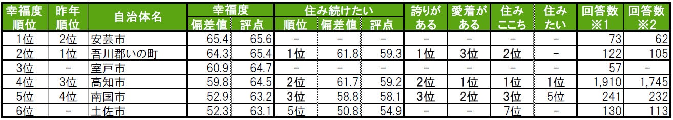 街の幸福度は、1位安芸市、2位吾川郡いの町、3位室戸市。