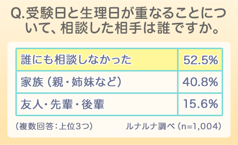 では、受験と生理が重なることについて、ルナルナユーザーは誰に相談したのでしょうか。結果は意外なことに「誰にも相談しなかった」52.5%が最も多い回答となりました。多くの女性が受験と生理の問題を一人で抱えているようです。