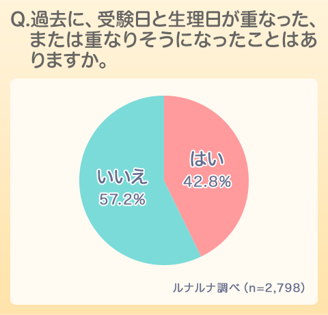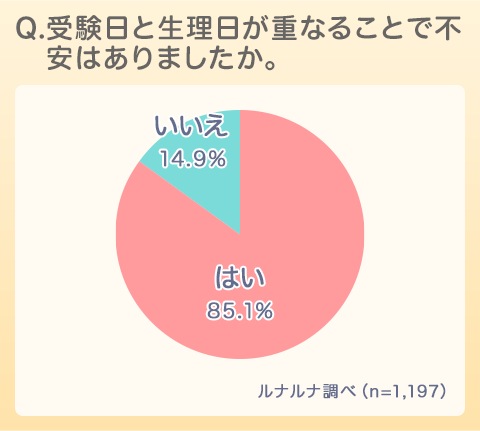初めに、受験経験のある女性を対象に、受験日と生理日が重なったこと、または重なりそうになったことがあるかを聞くと、「ある」が42.8%という結果となりました。さらに、「ある」と回答した人へ、受験日と生理日が重なることで不安があったかをたずねると、「はい」85.1%となり、実に8割以上の人が受験と生理がかぶってしまうことで何らかの不安を抱えていたことがわかりました。