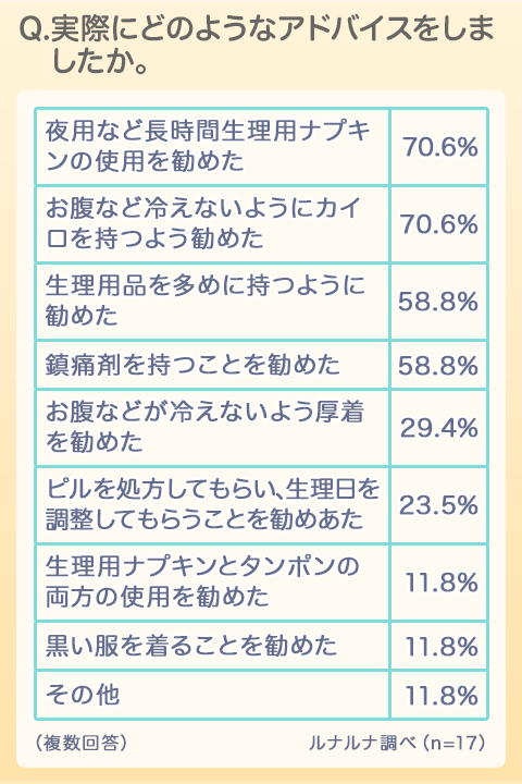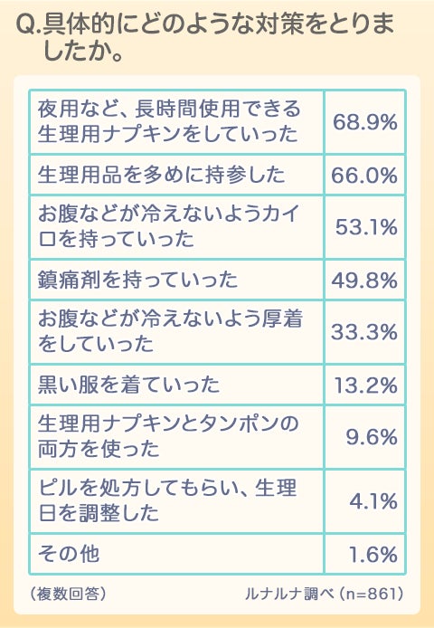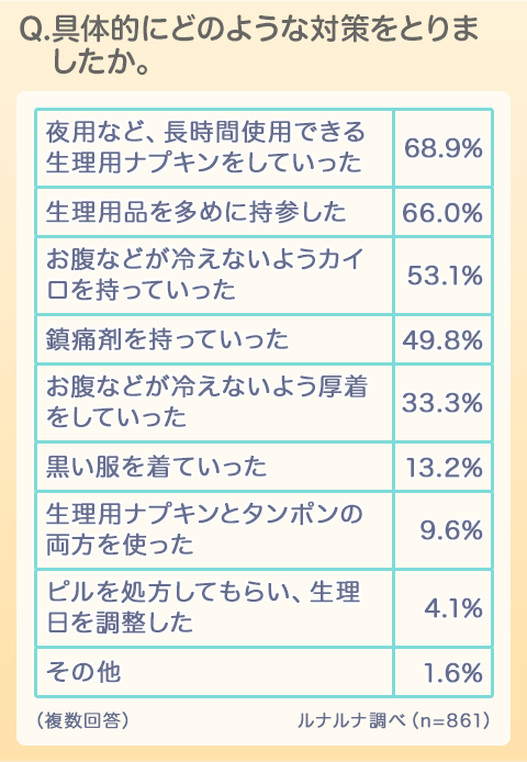 対策の具体的な回答をみてみると「夜用など、長時間使用できる生理用ナプキンをしていった」68.9%が1位となり、次いで「生理用品を多めに持参した」66.0%、「お腹などが冷えないようカイロを持っていった」53.1%となりました。