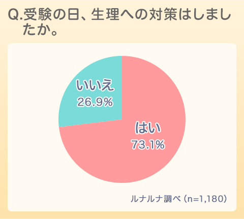 次に、受験と生理が重なった(重なりそうになった)人を対象に、受験の日に生理への対策をしたかをたずねると、「はい」73.1%となり、7割以上が何らかの生理対策をしていたという結果となりました。