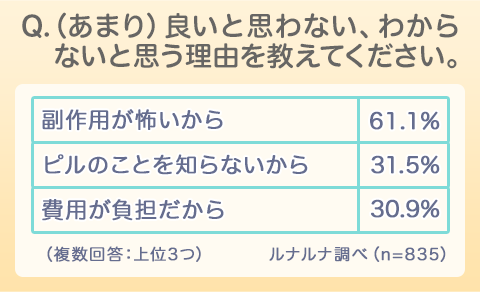 一方、「あまり良いとは思わない」「良いとは思わない」「わからない」と回答した人の理由としては「副作用が怖いから」61.1%が最も多い意見で、次いで「ピルのことを知らないから」31.5%でした。