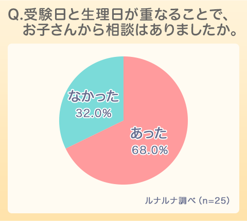 ★直前になって慌てることがないように、学校側から事前のインプット(受験と生理が被るかもしれないこと、受験日に突然生理が来るかもしれないこと、生理が重くて不安な人は事前に婦人科に通って生理日を調整することも選択肢としてあること等)をしてもらえたらありがたいと思った。