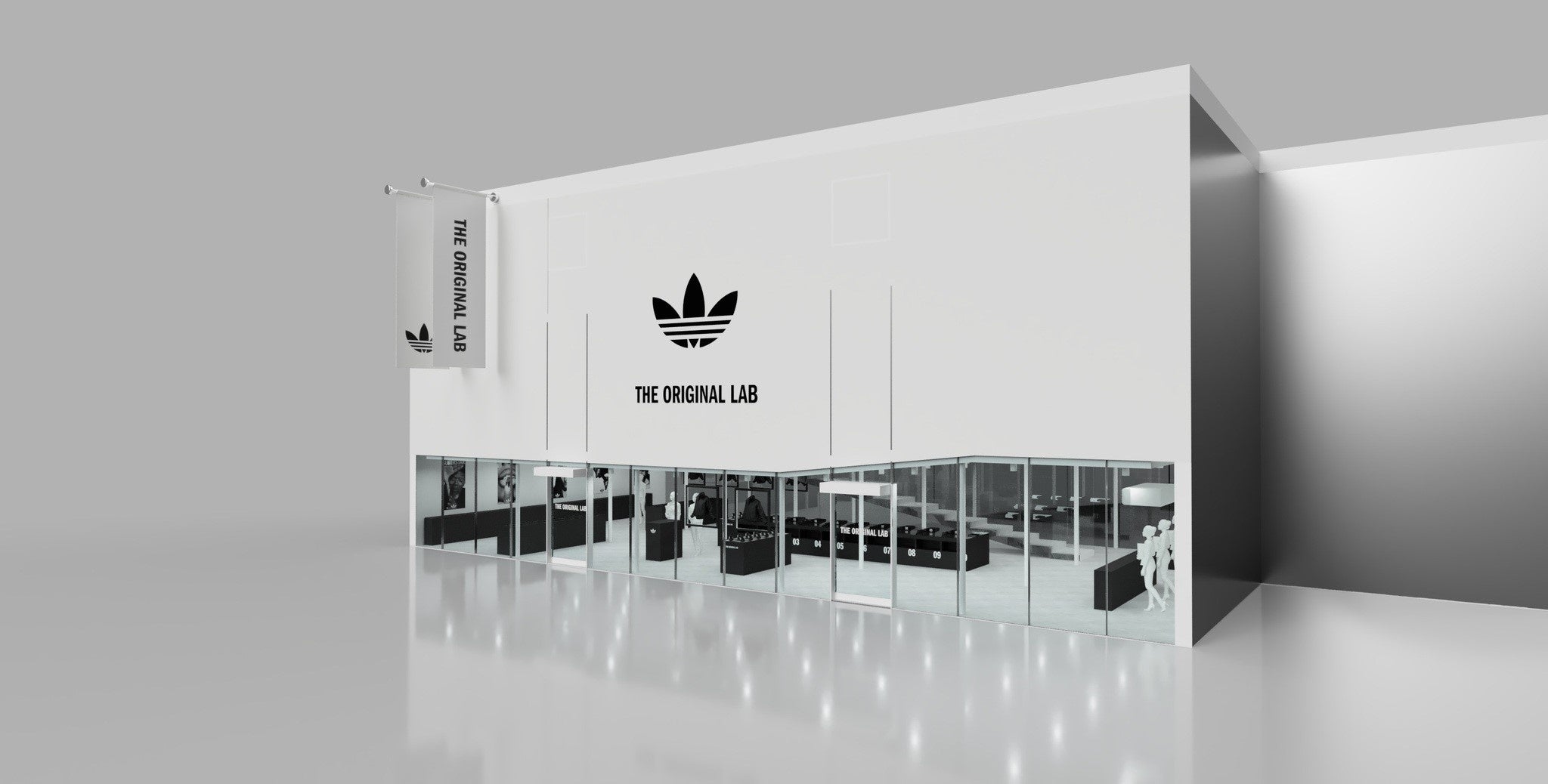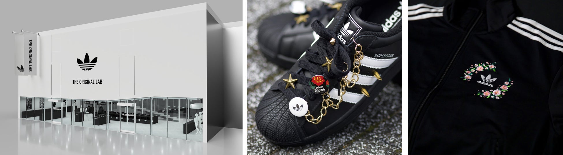 ラボをテーマにしたブラック&ホワイトの空間で、300種類以上のカスタマイズパーツや刺繍を使って、世界に一つだけのオリジナルな「SUPERSTAR」や「FIREBIRD」にカスタムマイズができる体験型イベント。