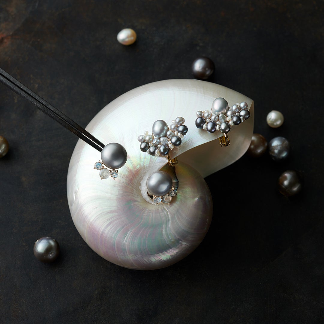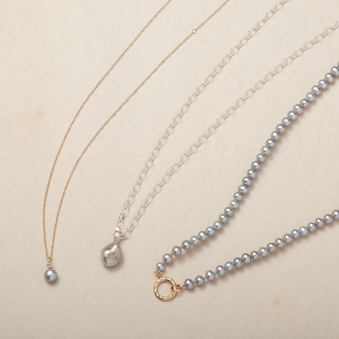 希少性の高い南洋パールをあえてシルバーに留め、カジュアルに仕上げたものや、チャームとのアレンジも楽しめるように開閉タイプの留め具を合わせたネックレス。落ち着いた雰囲気を纏うグレーパールは、白いTシャツや襟付きシャツなどに合わせたクールなスタイリングがおすすめ。