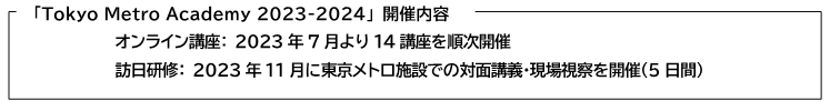 昨年度、「Tokyo Metro Academy 2022-2023」で8オンライン講座を開催したところ、14か国170名の方にご参加いただき、当社の取り組みに対して高い関心をお持ちいただきました。「Tokyo Metro Academy 2023-2024」では、オンライン講座を8講座から14講座に増加し、また、今回から新たに、東京メトロの施設での対面講義・現場視察を行う訪日研修を開催いたします。