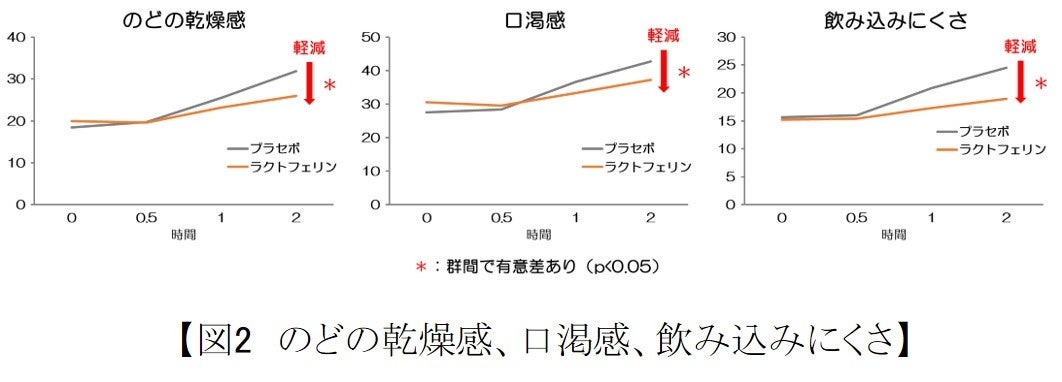より詳細な評価のため、口腔乾燥の調査に用いられる主観的評価も同時に行いました。その結果、「のどの乾燥感」、「口渇感」、「飲み込みにくさ」も、予めラクトフェリンを摂取することにより、プラセボの摂取と比較して有意に軽減しました。(図2)。