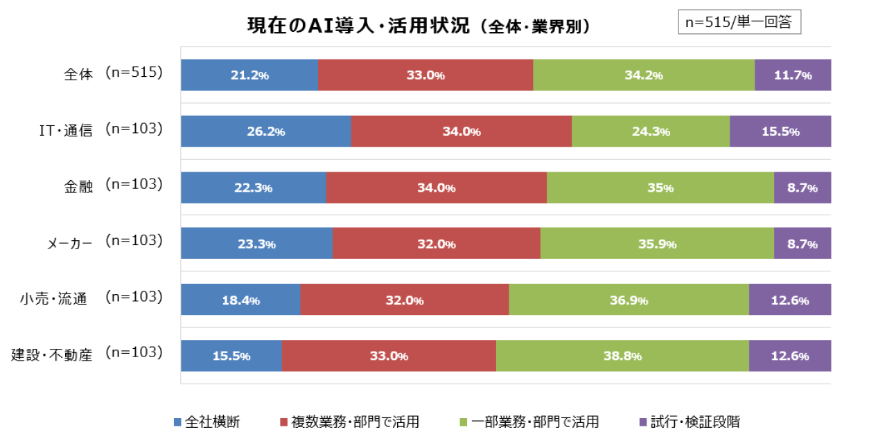 対象 :従業員数501人以上 AIツールを導入・活用している企業において、人事もしくは採用にかかわる22~69歳の担当者515人(IT通信、金融、メーカー、小売・流通、建設・不動産から各103サンプル)