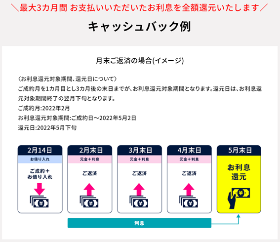 | キャンペーン内容 | 成約月を1カ月目とし、最大3カ月間お支払いいだだいた利息を全額還元します。 (利息還元対象期間の例) ・2022年2月14日(月) ご成約=2022年2月14日(月)~2022年5月2日(月)までに支払った利息を全額還元。(※) ・2022年3月1日(火) 成約=2022年3月1日(火)~2022年5月31日(火)までに支払った利息を全額還元。 ・2022年4月1日(金) 成約=2022年4月1日(金)~2022年6月30日(木)までに支払った利息を全額還元。 ※利息還元期間の最終日が金融機関休業日の場合は、実際の約定日を最終日とします。 |