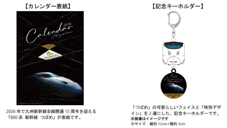 来年2026年は、「九州新幹線」の全線開業15周年を迎えるアニバーサリーイヤーです。前回ご好評いただいた【2026年JR九州列車カレンダー】の特典第1弾「800系新幹線つばめ記念缶バッジ」に続き、第2弾として「2連キーホルダー」をご用意しました。愛らしい「つばめ」の顔と記念デザインを組み合わせた限定400個の記念キーホルダーです。2026年のJR九州列車カレンダーとともに、「800系新幹線つばめ」と過ごす特別な一年をお楽しみください。