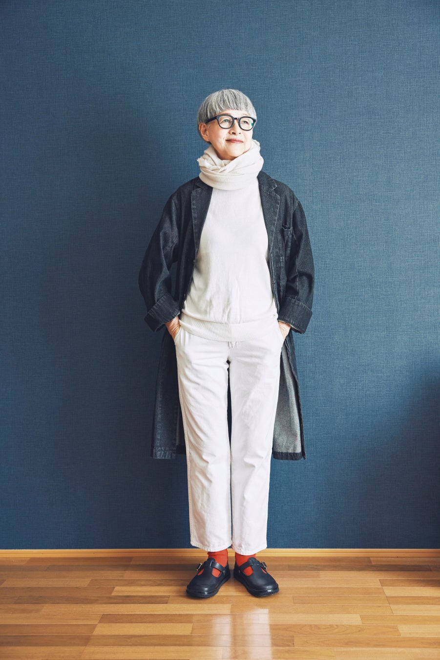 小和田妙子さんの場合。モノトーンを華やかに着るコツは、①ピンと伸びた姿勢、②太縁メガネで引き締める、③靴下で差し色を少し入れる、④首元に白をはさむ。