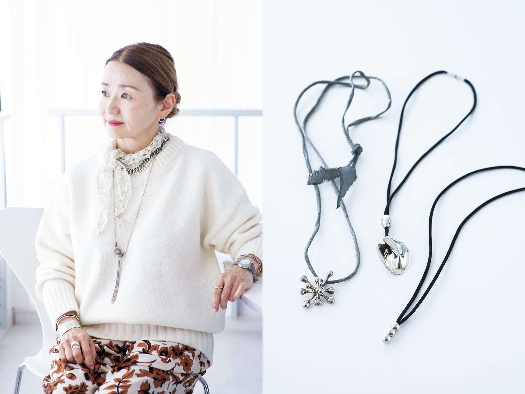「ル・ピボット」のデザイナー・小林一美さん。白いニットにボリュームのあるシルバーのチェーンネックレスと、タッセルネックレスを合わせた、ホワイトコーデが素敵。右は、小林さん愛用品。シルクコードなので、つけ心地が軽いのも魅力。