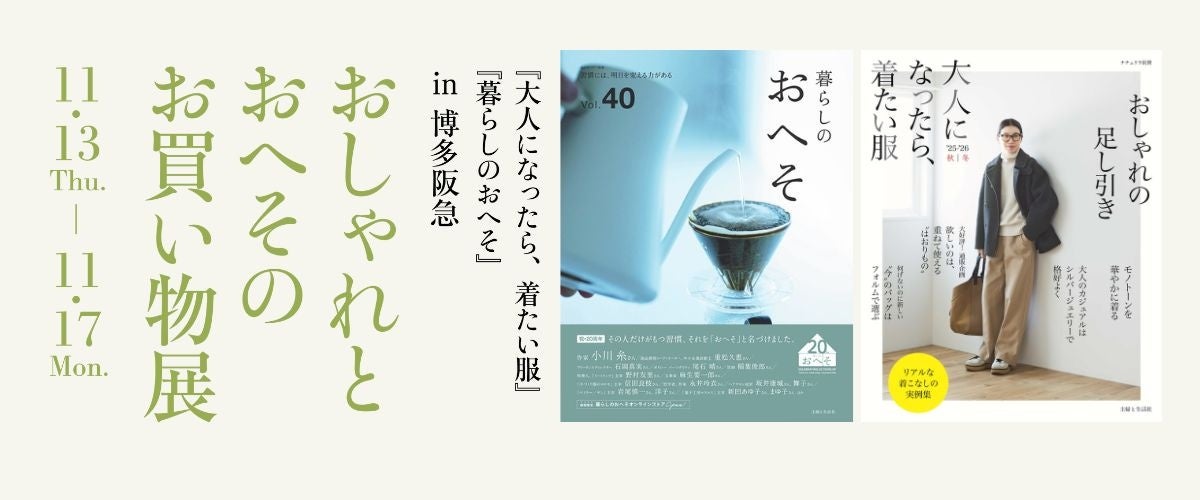 おしゃれな大人のリアルクローズを紹介する『大人になったら、着たい服』と、素敵な人のもつ習慣を「おへそ」と名付け、ご紹介する『暮らしのおへそ』。2誌の合同によるお買い物イベントを実施。秋冬のおしゃれを盛り上げるアイテムから、暮らしに新しい習慣をもたらしてくれる道具が、一堂にそろいます。文筆家・一田憲子さんと、出店者たちによるトークイベントも開催予定。