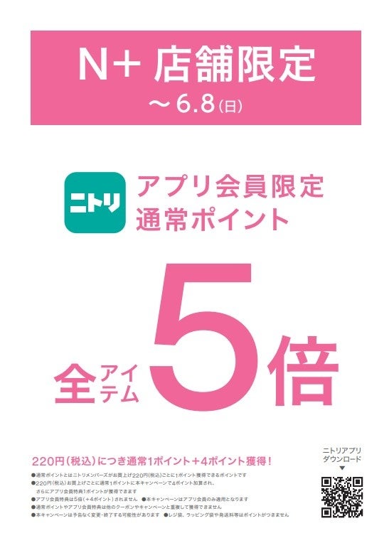 【ニトリのアパレルブランドN+】ニトリアプリ会員限定!通常ポイント5倍キャンペーンをN+全国44店舗にて開催