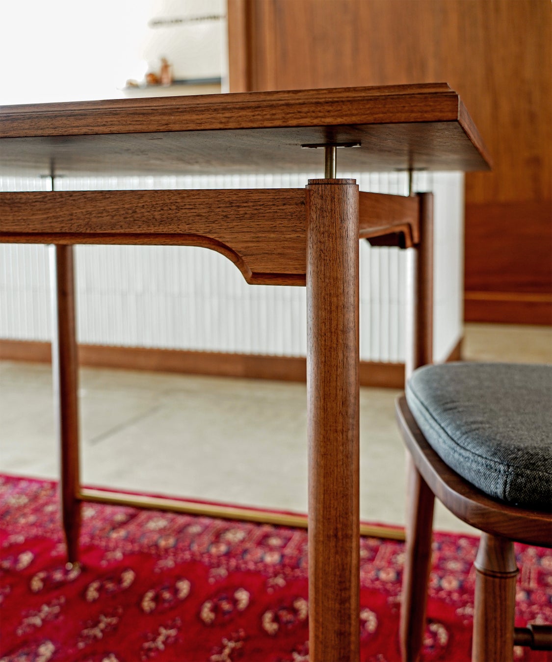 新登場のEPI DINING TABLE(エピ ダイニングテーブル)は、ダイニングシーンのなかでスタイリングのポイントになるようディティールにこだわりました。サイドから見た時に軽やかな浮遊感を感じられるよう、天板と脚との間に空間を作りました。スリムなペンシル型の脚の間にはテーブル全体の補強を兼ねた真鍮色塗装のスチールパイプを入れ、幕板の下の掘り込みと相まってクラシカルなデザインに仕上げています。