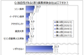 提供しているサービスの品質が高いと思う損害保険会社は(複数回答)、「東京海上日動火災保険」「ソニー損保」「三井住友海上火災保険」「損害保険ジャパン」が各10%台です。「いずれもない」が46.8%となっています。