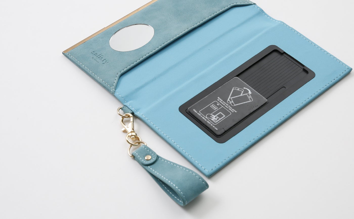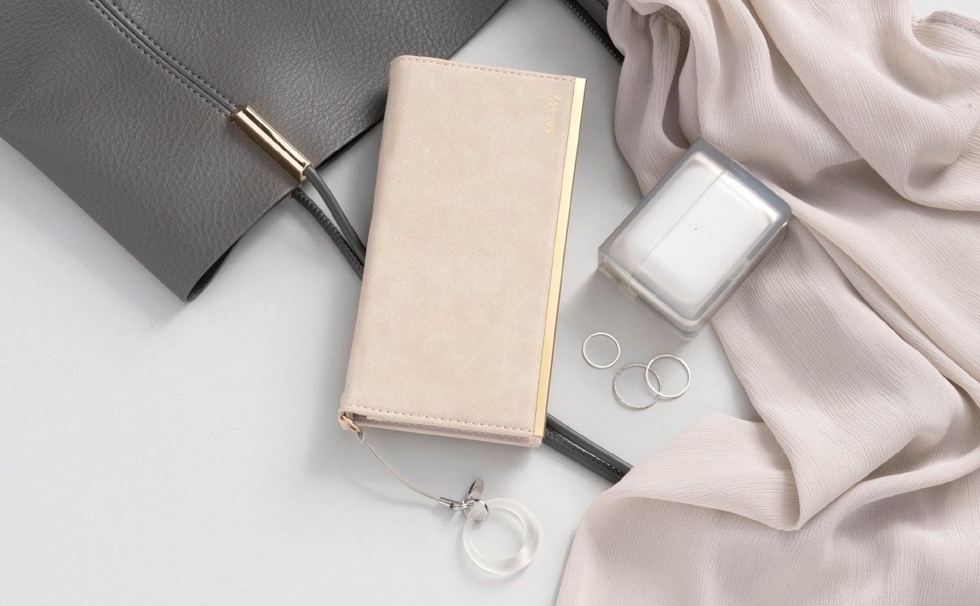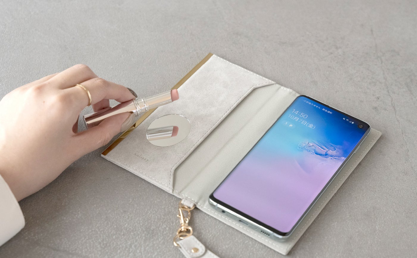 発売から4年経った今でも、大人の女性に愛されている本製品は、しっとりとしたスエード調の生地と、ゴールドのラインパーツが上品なデザイン。カバーの内側に身だしなみを確認できるミラーが付いているほか、落下防止のフィンガーストラップが付属しています。カラーは、洗練されたトレンドカラー4色のバリエーションです。